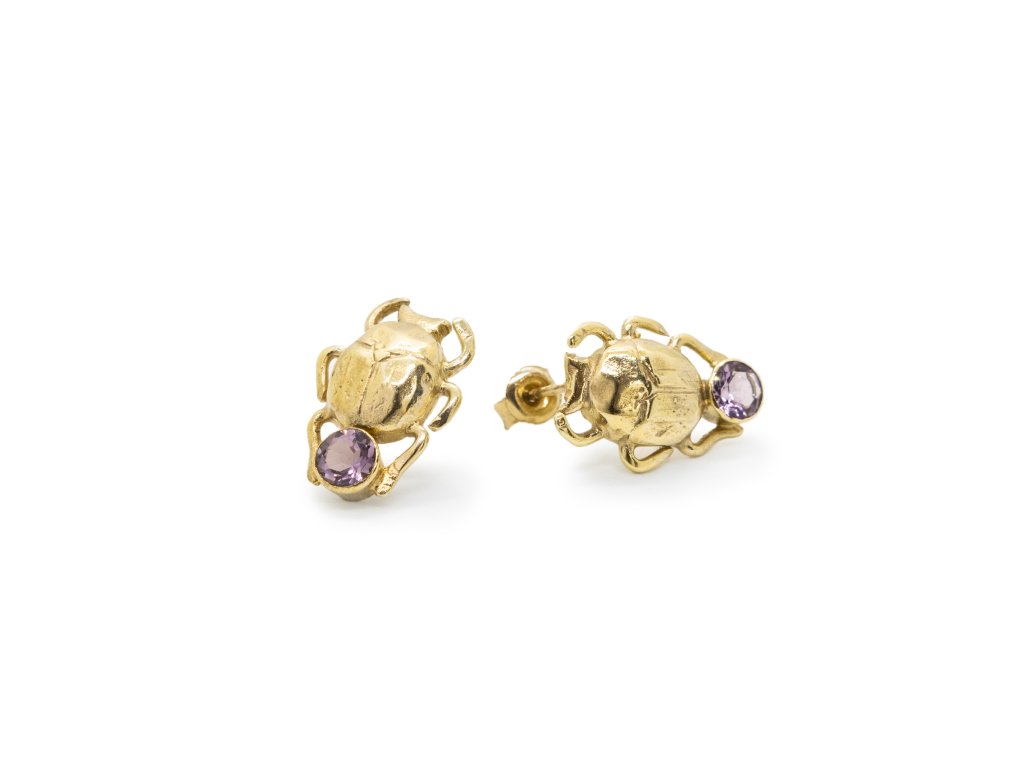 Náušnice s motivem zlatého skarabea s ametystem o průměru 5 mm, ze 14 karátového zlata.